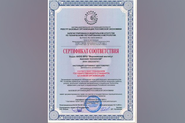 Воронежский институт высоких технологий получил сертификат соответствия, который удостоверяет, что его деятельность соответствует требованиям государственного стандарта базовой организации Российской экономики. ВИВТ подтвердил соблюдение норм действующего законодательства РФ, является устойчиво прибыльной организацией, выпускает конкурентоспособную продукцию (работы, услуги), использует новейшие материальные и социальные технологии, эффективно участвует в модернизации Российской экономики. А также имеет аргументированное право на участие в государственных (муниципальных), коммерческих программах и проектах.
