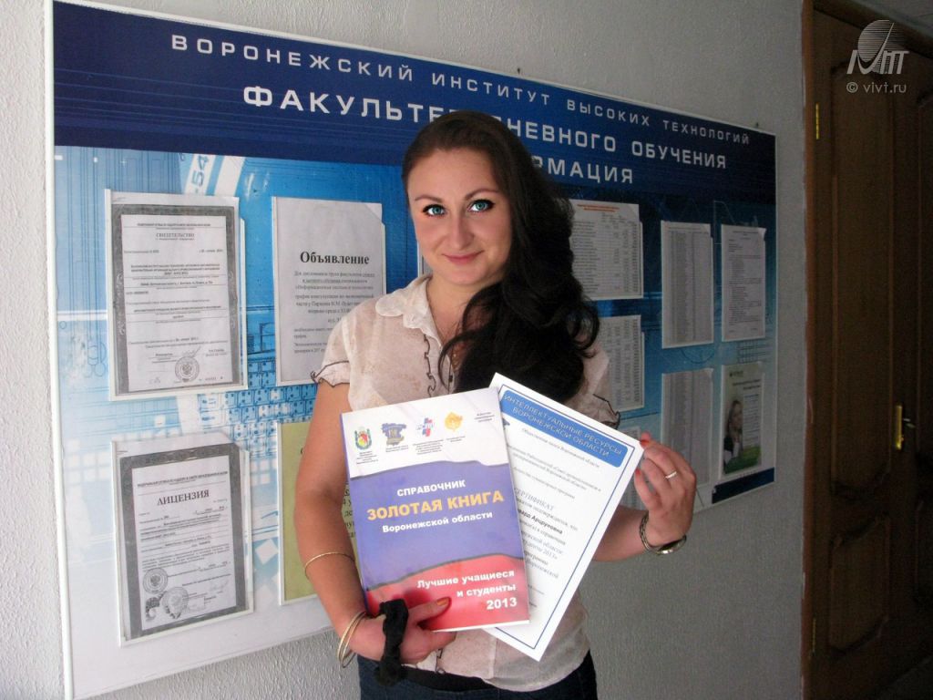 члены молодежного Общественного Совета при главе города, в преддверие дня молодежи, встретились с и.о. мэра Воронежа Геннадием ЧернушкинымВышла в свет “Золотая книга Воронежской области: лучшие учащиеся и студенты 2013”, в этом году «золотыми» выпускниками стали более 1500 талантливых учащихся и студентов. Среди них – талантливая молодежь ВИВТ.