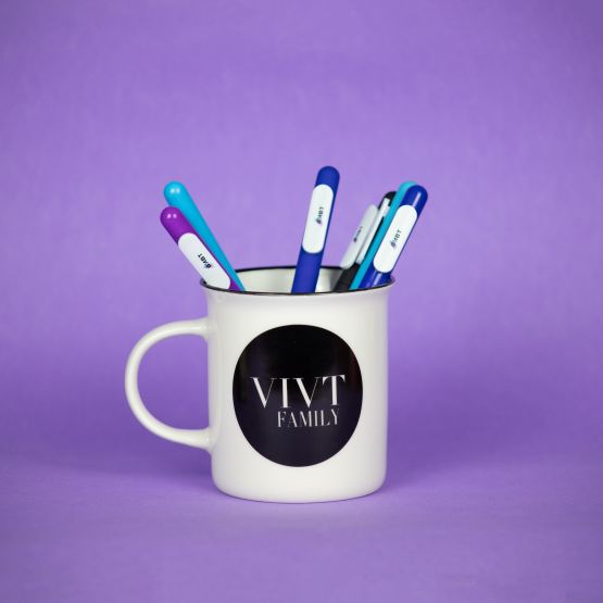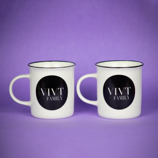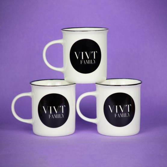 Стильная и элегантная кружка такой знакомой формы, как в советских пионерских лагерях! Белое глянцевое покрытие дополняет черный кант и круглый логотип VIVTFamily. Глоток крепкого кофе с утра, чай, выпитый в перерыве между делами, или какао с зефирками после рабочего дня – кружка VIVTfamily впишется в любое настроение.